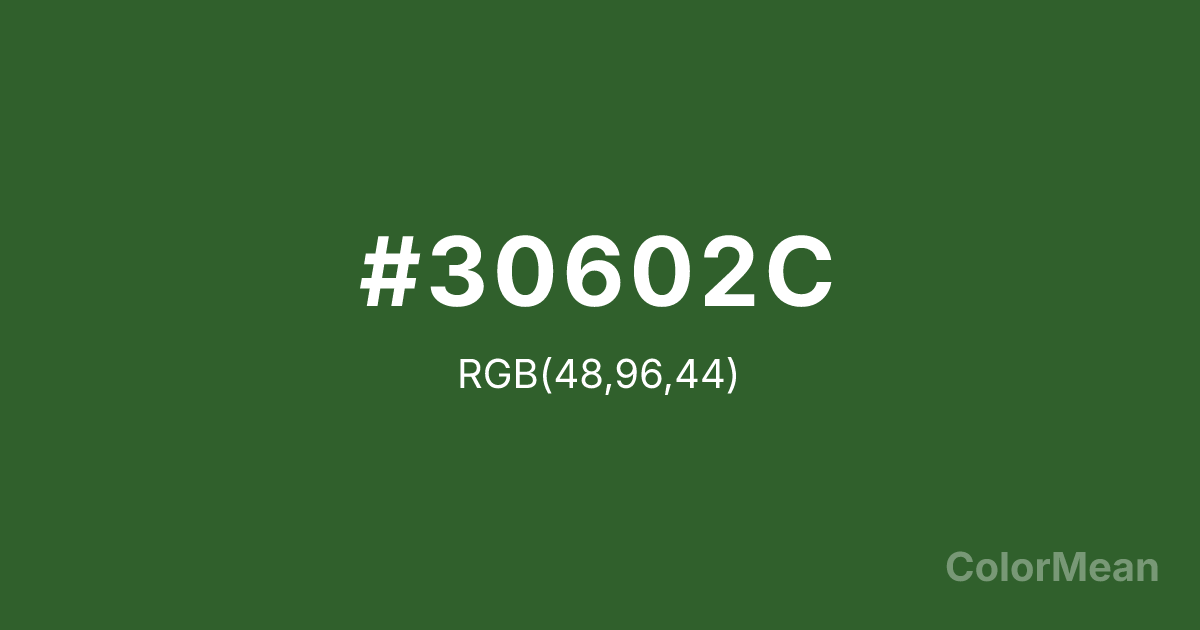 #30602C RGB value is (48, 96, 44). The hex color red value is 48, green is 96, and blue is 44. Its HSL format shows a hue of 115°, saturation of 37 percent, and lightness of 27 percent. The CMYK process values are 50 percent, 0 percent, 54 percent, 62 percent.