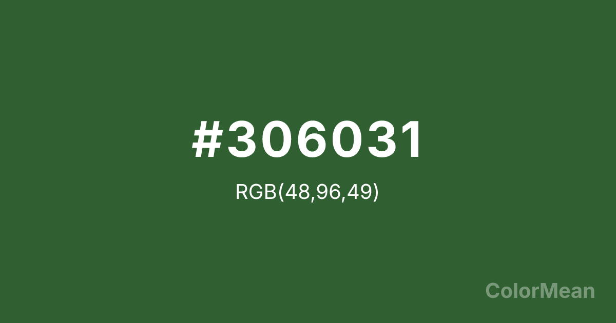 #306031 RGB value is (48, 96, 49). The hex color red value is 48, green is 96, and blue is 49. Its HSL format shows a hue of 121°, saturation of 33 percent, and lightness of 28 percent. The CMYK process values are 50 percent, 0 percent, 49 percent, 62 percent.