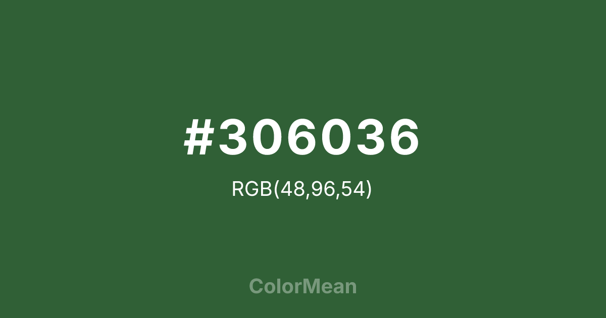 #306036 RGB value is (48, 96, 54). The hex color red value is 48, green is 96, and blue is 54. Its HSL format shows a hue of 128°, saturation of 33 percent, and lightness of 28 percent. The CMYK process values are 50 percent, 0 percent, 44 percent, 62 percent.