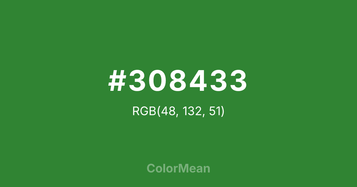 #308433 RGB value is (48, 132, 51). The hex color red value is 48, green is 132, and blue is 51. Its HSL format shows a hue of 122°, saturation of 47 percent, and lightness of 35 percent. The CMYK process values are 64 percent, 0 percent, 61 percent, 48 percent.