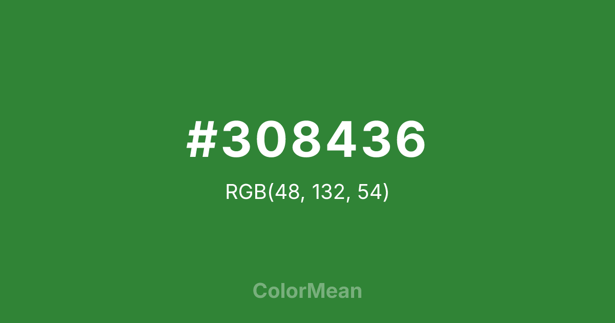 #308436 RGB value is (48, 132, 54). The hex color red value is 48, green is 132, and blue is 54. Its HSL format shows a hue of 124°, saturation of 47 percent, and lightness of 35 percent. The CMYK process values are 64 percent, 0 percent, 59 percent, 48 percent.