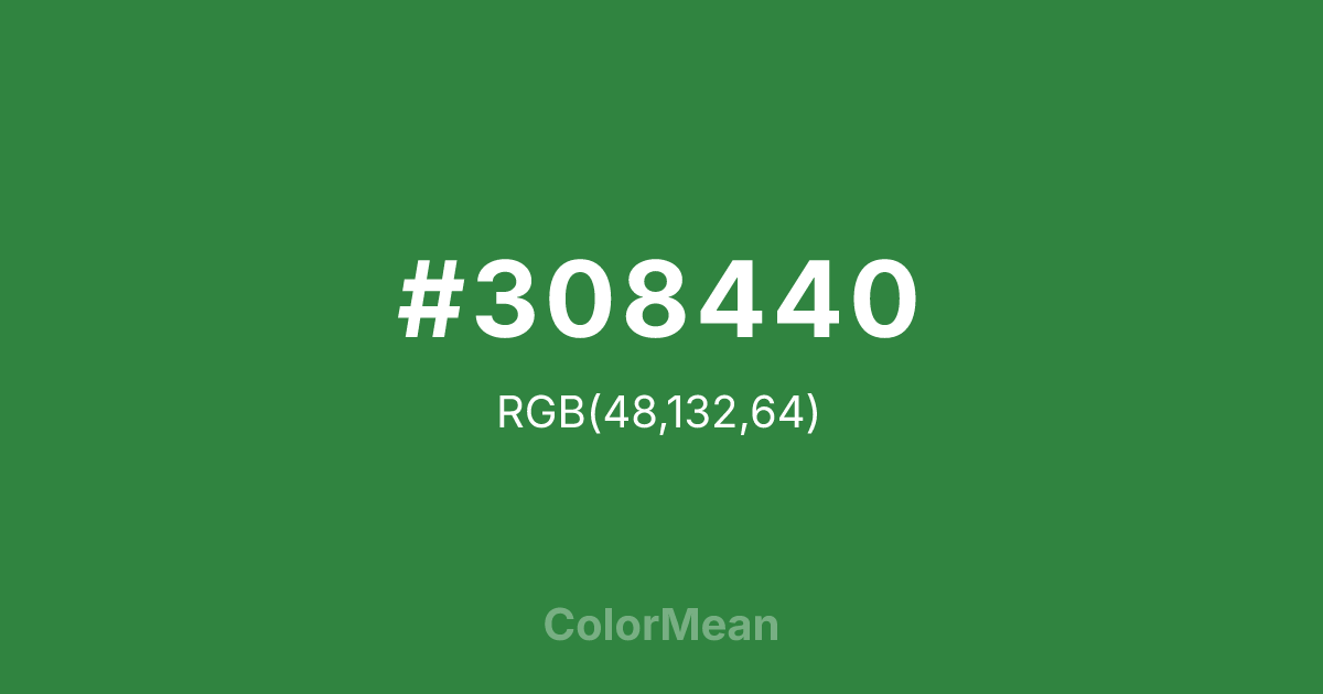 #308440 RGB value is (48, 132, 64). The hex color red value is 48, green is 132, and blue is 64. Its HSL format shows a hue of 131°, saturation of 47 percent, and lightness of 35 percent. The CMYK process values are 64 percent, 0 percent, 52 percent, 48 percent.