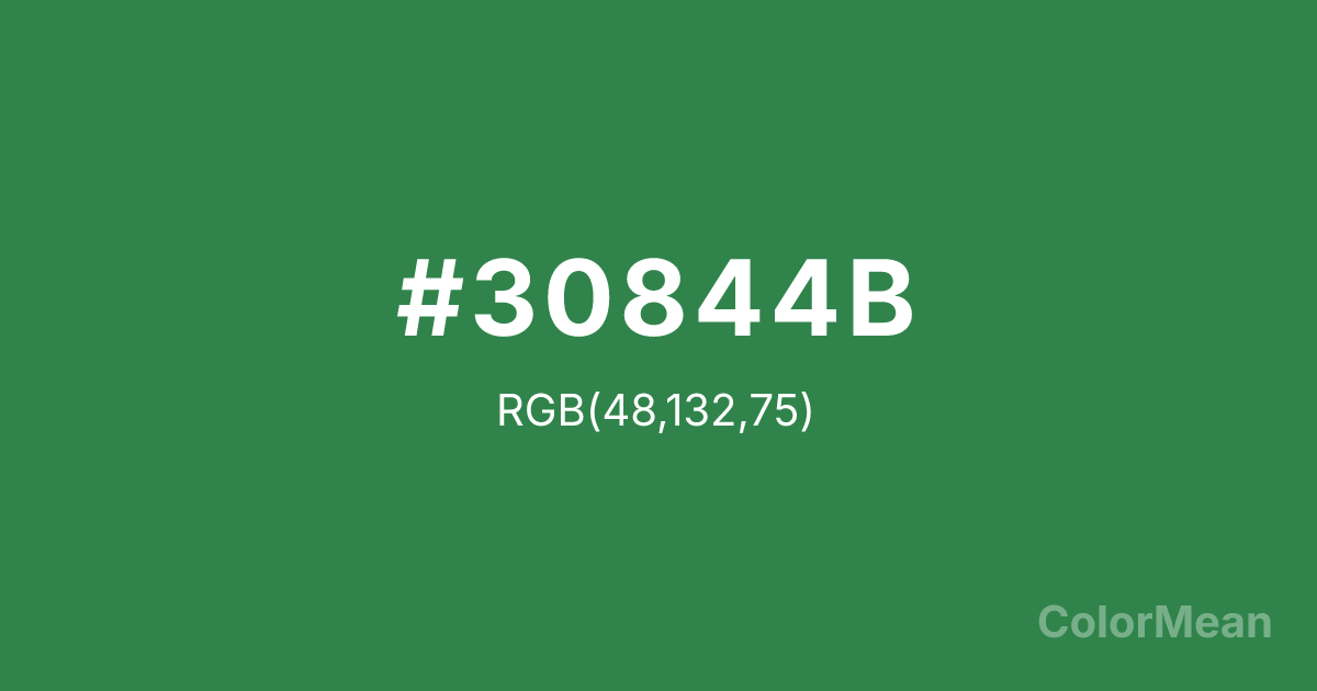 #30844B RGB value is (48, 132, 75). The hex color red value is 48, green is 132, and blue is 75. Its HSL format shows a hue of 139°, saturation of 47 percent, and lightness of 35 percent. The CMYK process values are 64 percent, 0 percent, 43 percent, 48 percent.