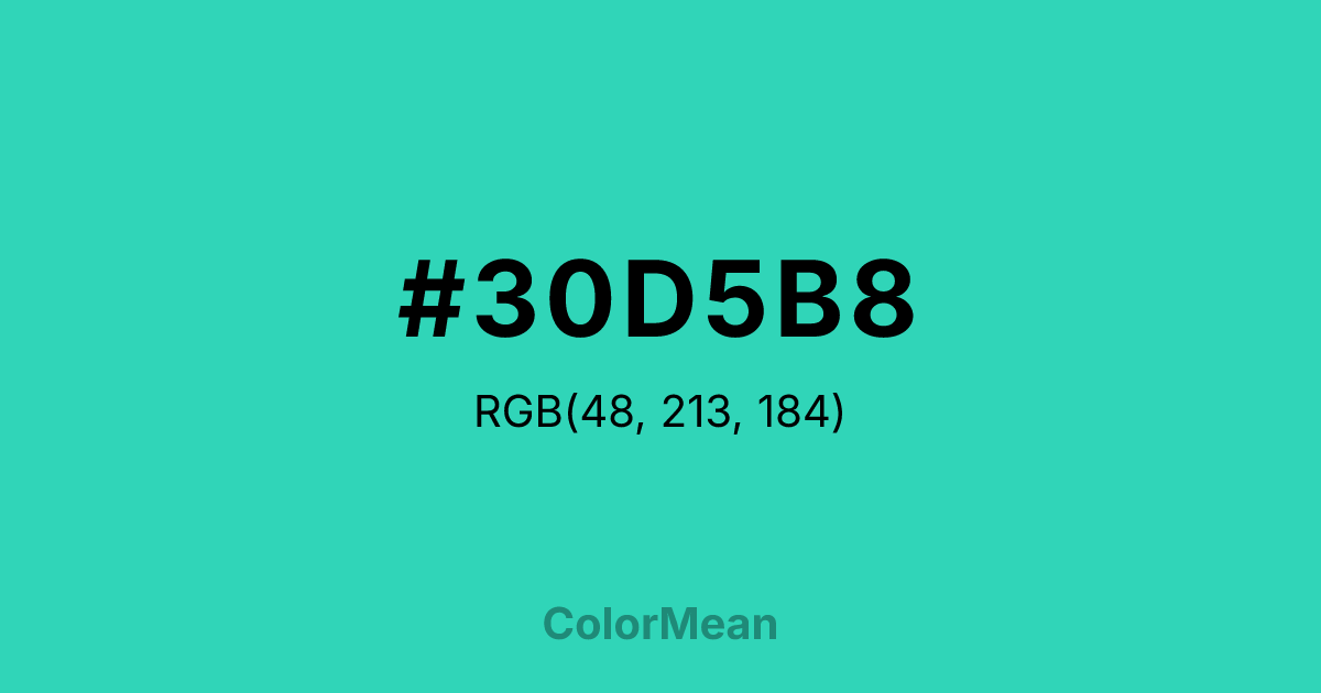 #30D5B8 RGB value is (48, 213, 184). The hex color red value is 48, green is 213, and blue is 184. Its HSL format shows a hue of 169°, saturation of 66 percent, and lightness of 51 percent. The CMYK process values are 77 percent, 0 percent, 14 percent, 16 percent.