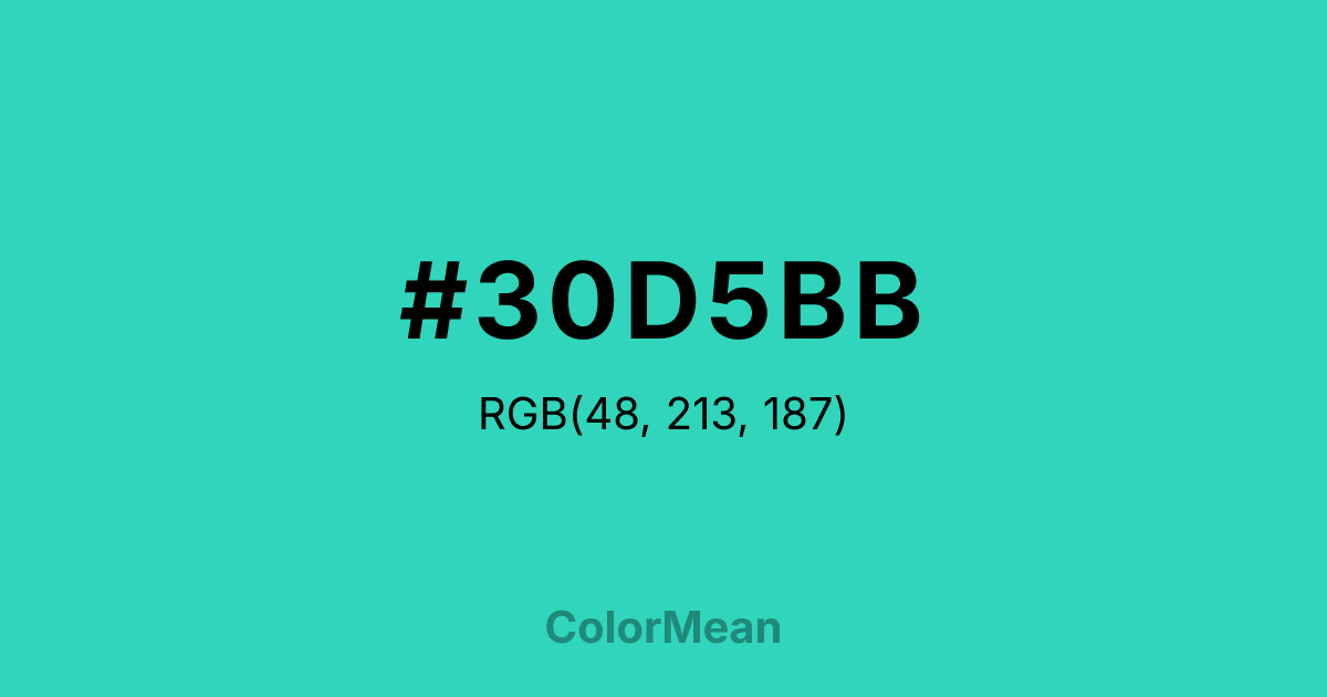 #30D5BB RGB value is (48, 213, 187). The hex color red value is 48, green is 213, and blue is 187. Its HSL format shows a hue of 171°, saturation of 66 percent, and lightness of 51 percent. The CMYK process values are 77 percent, 0 percent, 12 percent, 16 percent.