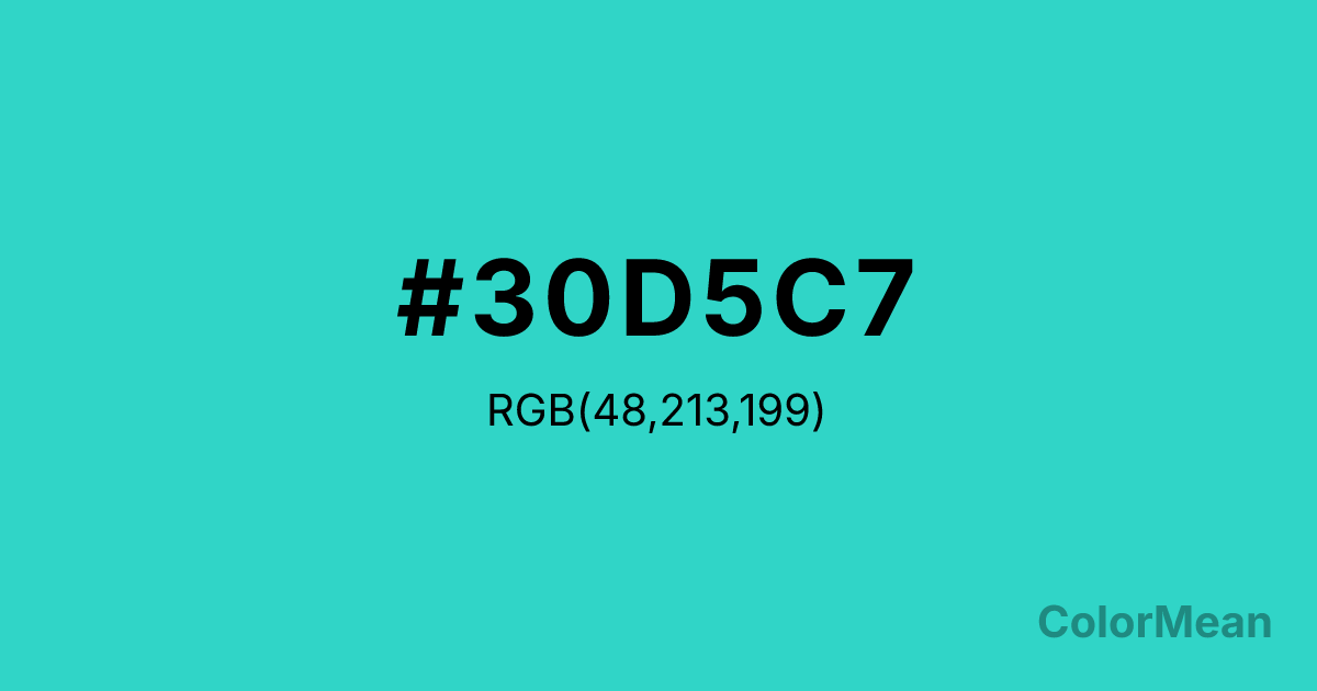 #30D5C7 RGB value is (48, 213, 199). The hex color red value is 48, green is 213, and blue is 199. Its HSL format shows a hue of 175°, saturation of 66 percent, and lightness of 51 percent. The CMYK process values are 77 percent, 0 percent, 7 percent, 16 percent.