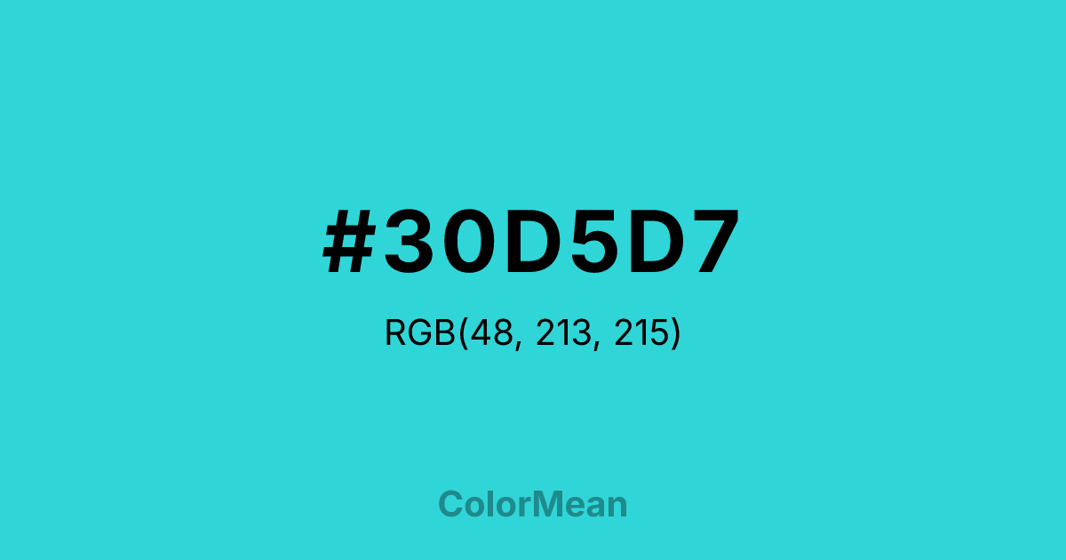#30D5D7 RGB value is (48, 213, 215). The hex color red value is 48, green is 213, and blue is 215. Its HSL format shows a hue of 181°, saturation of 68 percent, and lightness of 52 percent. The CMYK process values are 78 percent, 1 percent, 0 percent, 16 percent.