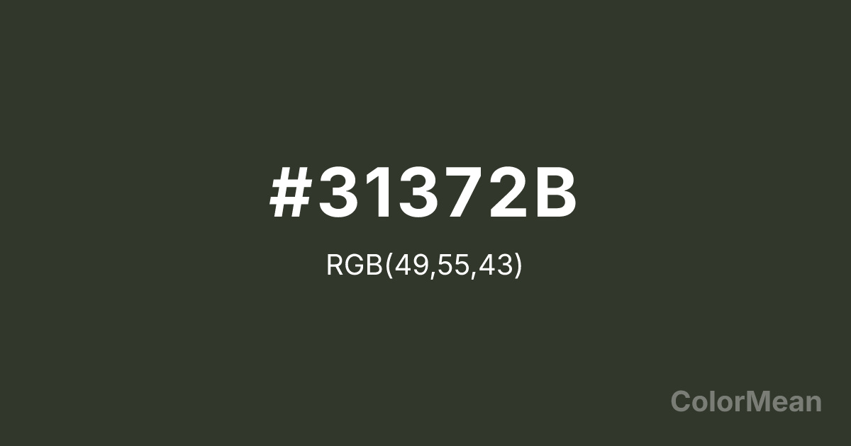 Fir Green (#31372B) RGB value is (49, 55, 43). The hex color red value is 49, green is 55, and blue is 43. Its HSL format shows a hue of 90°, saturation of 12 percent, and lightness of 19 percent. The CMYK process values are 11 percent, 0 percent, 22 percent, 78 percent.