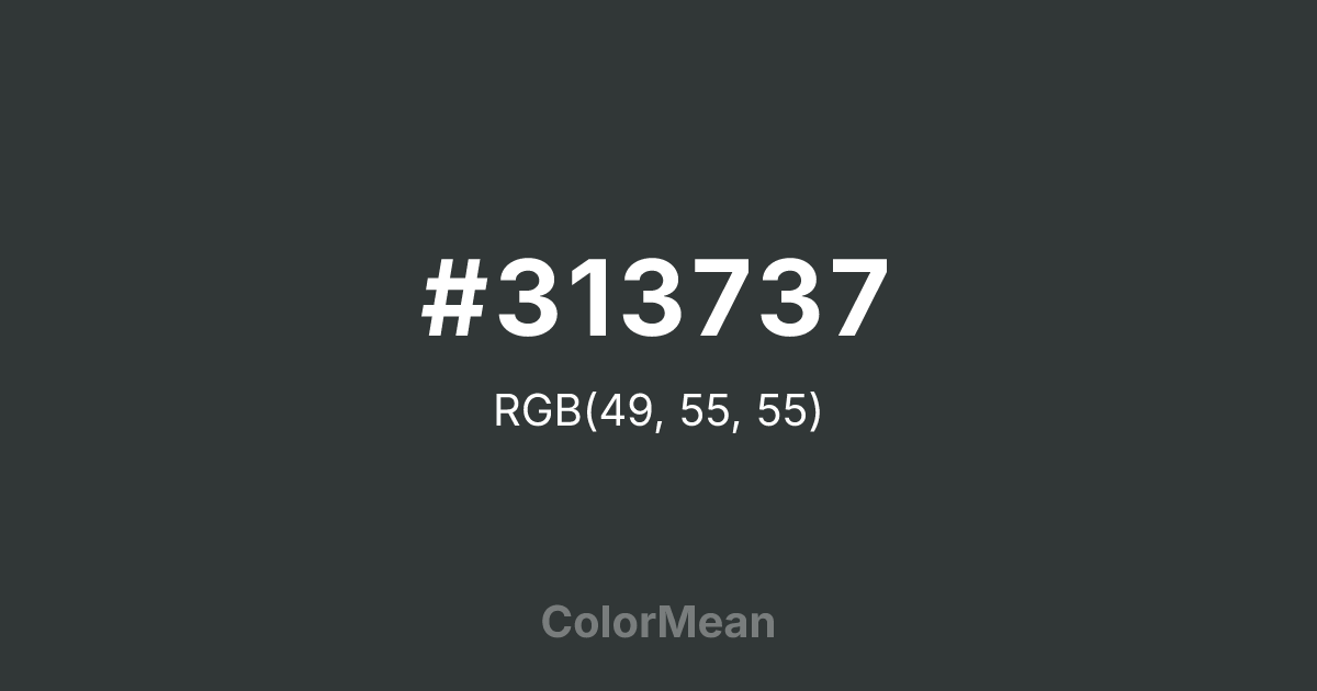 #313737 RGB value is (49, 55, 55). The hex color red value is 49, green is 55, and blue is 55. Its HSL format shows a hue of 180°, saturation of 6 percent, and lightness of 20 percent. The CMYK process values are 11 percent, 0 percent, 0 percent, 78 percent.