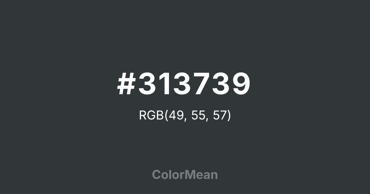 #313739 RGB value is (49, 55, 57). The hex color red value is 49, green is 55, and blue is 57. Its HSL format shows a hue of 195°, saturation of 8 percent, and lightness of 21 percent. The CMYK process values are 14 percent, 4 percent, 0 percent, 78 percent.