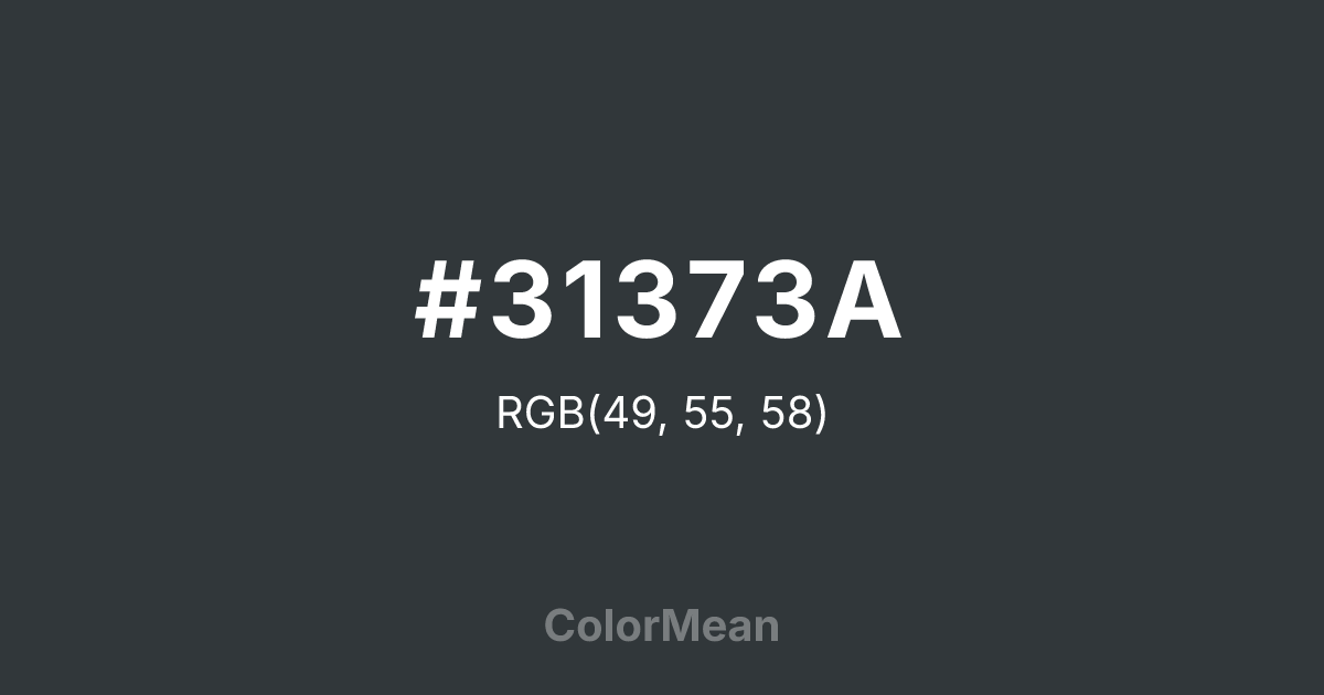 #31373A RGB value is (49, 55, 58). The hex color red value is 49, green is 55, and blue is 58. Its HSL format shows a hue of 200°, saturation of 8 percent, and lightness of 21 percent. The CMYK process values are 16 percent, 5 percent, 0 percent, 77 percent.