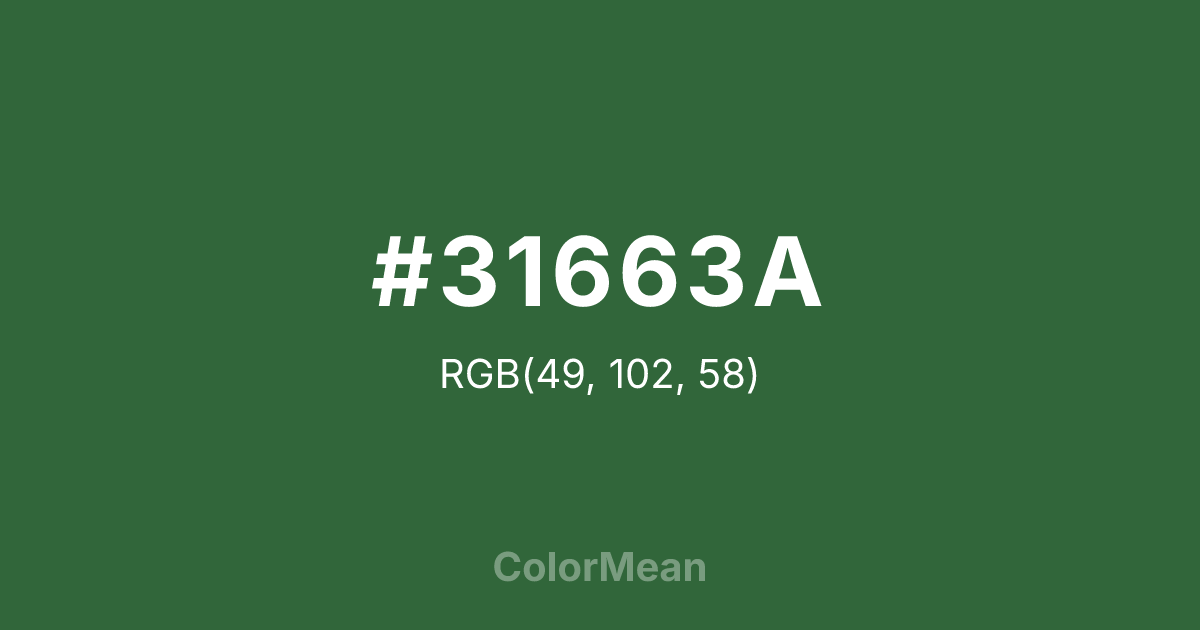 #31663A RGB value is (49, 102, 58). The hex color red value is 49, green is 102, and blue is 58. Its HSL format shows a hue of 130°, saturation of 35 percent, and lightness of 30 percent. The CMYK process values are 52 percent, 0 percent, 43 percent, 60 percent.