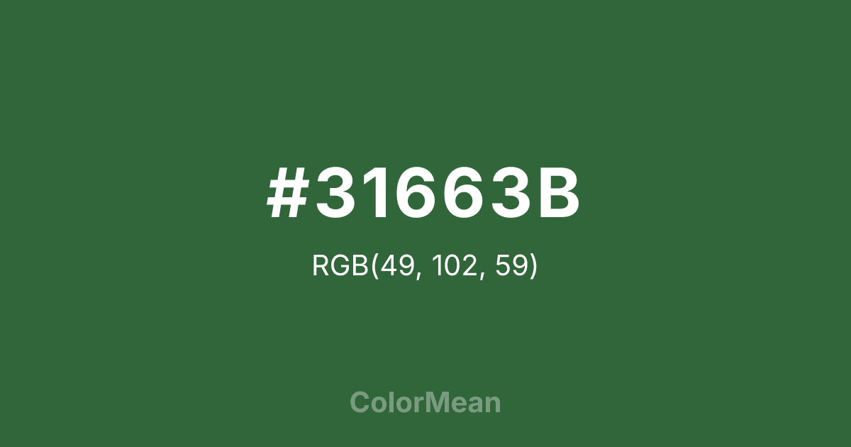 #31663B RGB value is (49, 102, 59). The hex color red value is 49, green is 102, and blue is 59. Its HSL format shows a hue of 131°, saturation of 35 percent, and lightness of 30 percent. The CMYK process values are 52 percent, 0 percent, 42 percent, 60 percent.