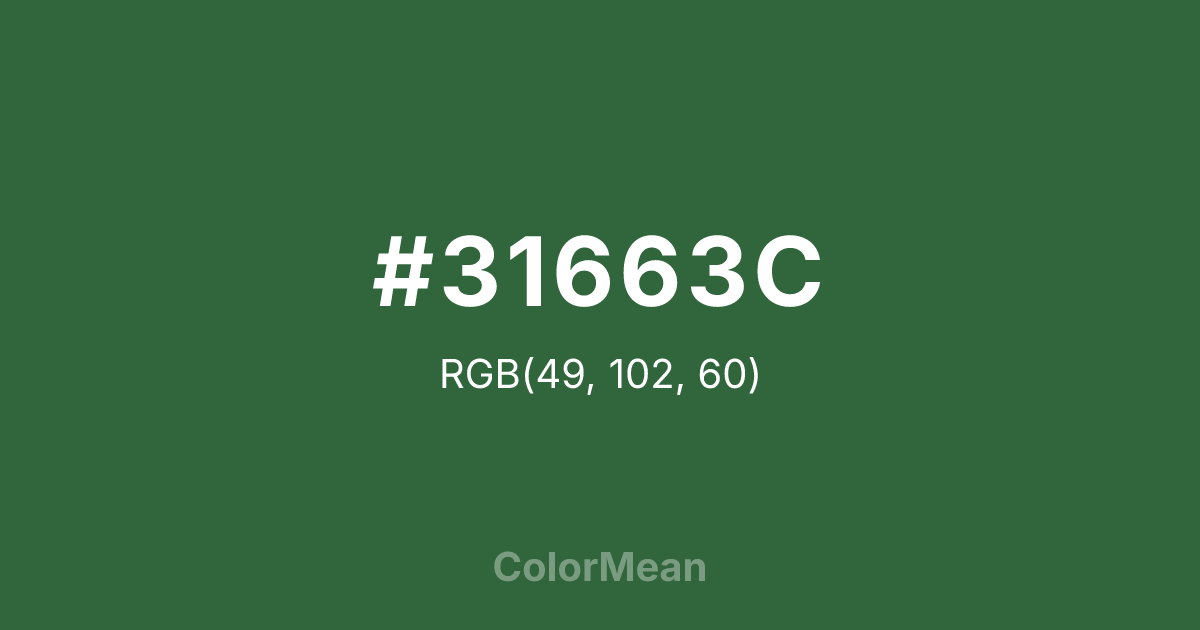 #31663C RGB value is (49, 102, 60). The hex color red value is 49, green is 102, and blue is 60. Its HSL format shows a hue of 132°, saturation of 35 percent, and lightness of 30 percent. The CMYK process values are 52 percent, 0 percent, 41 percent, 60 percent.
