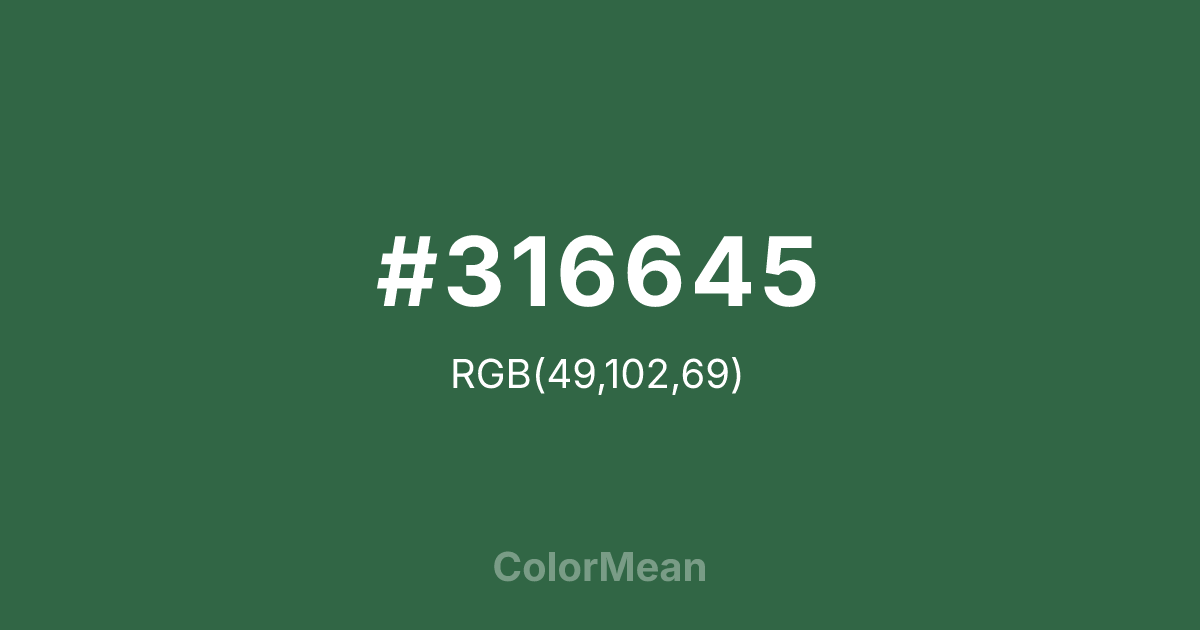 #316645 RGB value is (49, 102, 69). The hex color red value is 49, green is 102, and blue is 69. Its HSL format shows a hue of 143°, saturation of 35 percent, and lightness of 30 percent. The CMYK process values are 52 percent, 0 percent, 32 percent, 60 percent.