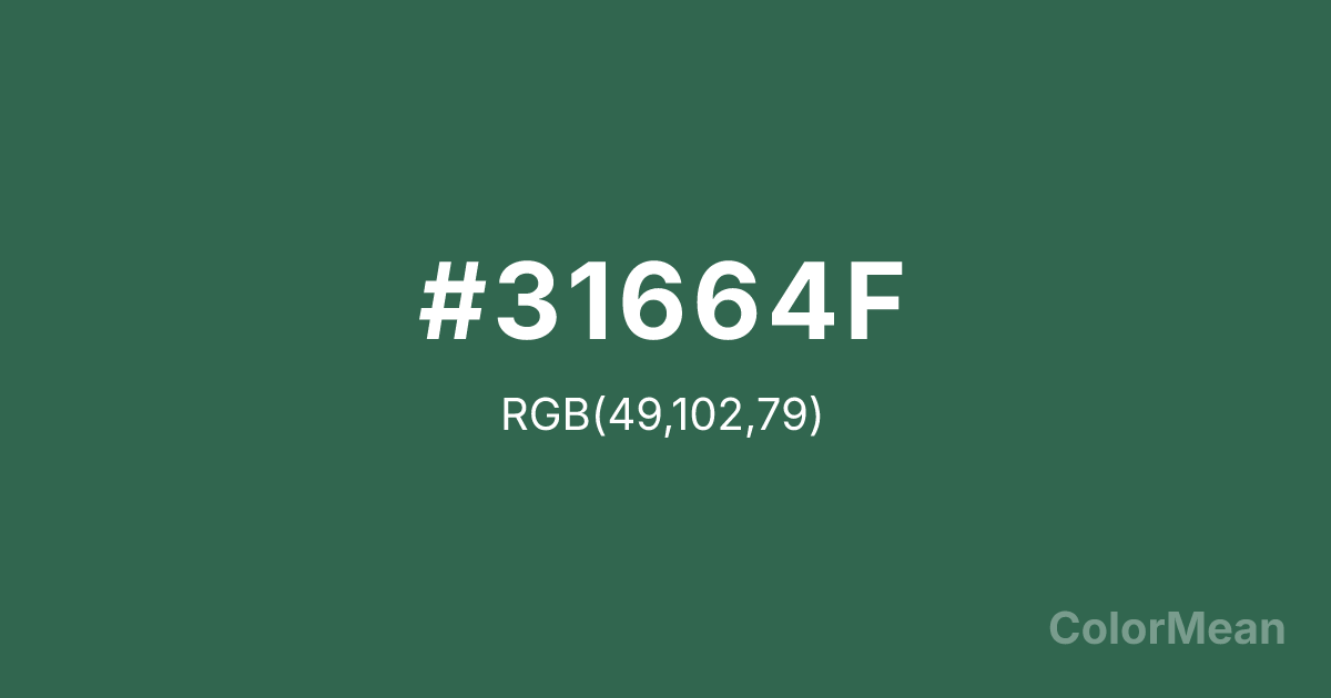 #31664F RGB value is (49, 102, 79). The hex color red value is 49, green is 102, and blue is 79. Its HSL format shows a hue of 154°, saturation of 35 percent, and lightness of 30 percent. The CMYK process values are 52 percent, 0 percent, 23 percent, 60 percent.