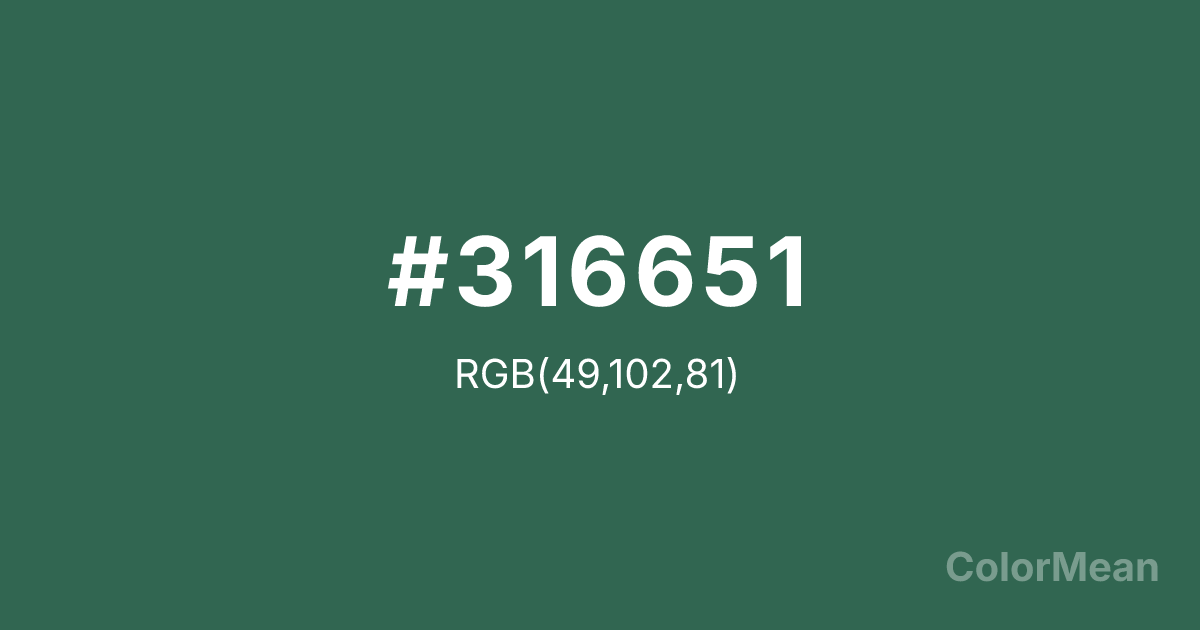 #316651 RGB value is (49, 102, 81). The hex color red value is 49, green is 102, and blue is 81. Its HSL format shows a hue of 156°, saturation of 35 percent, and lightness of 30 percent. The CMYK process values are 52 percent, 0 percent, 21 percent, 60 percent.