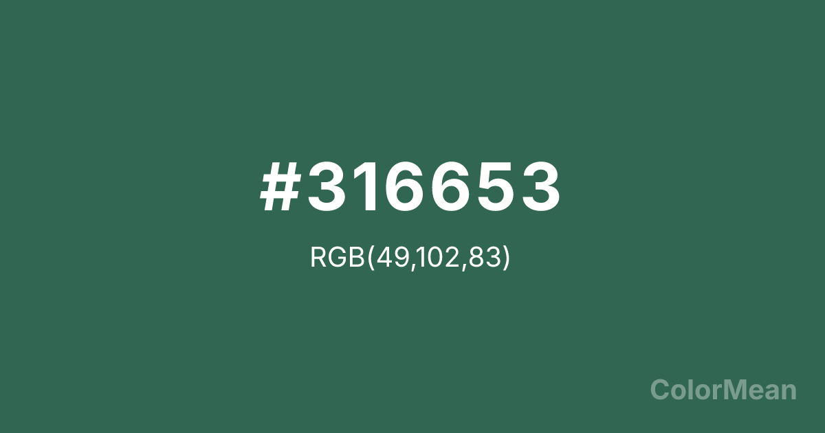 #316653 RGB value is (49, 102, 83). The hex color red value is 49, green is 102, and blue is 83. Its HSL format shows a hue of 158°, saturation of 35 percent, and lightness of 30 percent. The CMYK process values are 52 percent, 0 percent, 19 percent, 60 percent.