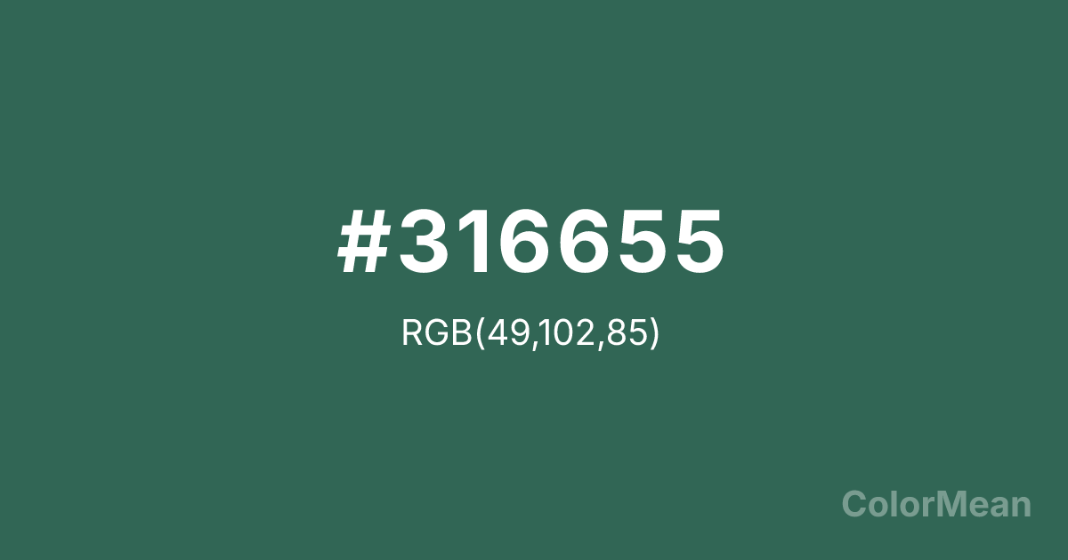 #316655 RGB value is (49, 102, 85). The hex color red value is 49, green is 102, and blue is 85. Its HSL format shows a hue of 161°, saturation of 35 percent, and lightness of 30 percent. The CMYK process values are 52 percent, 0 percent, 17 percent, 60 percent.