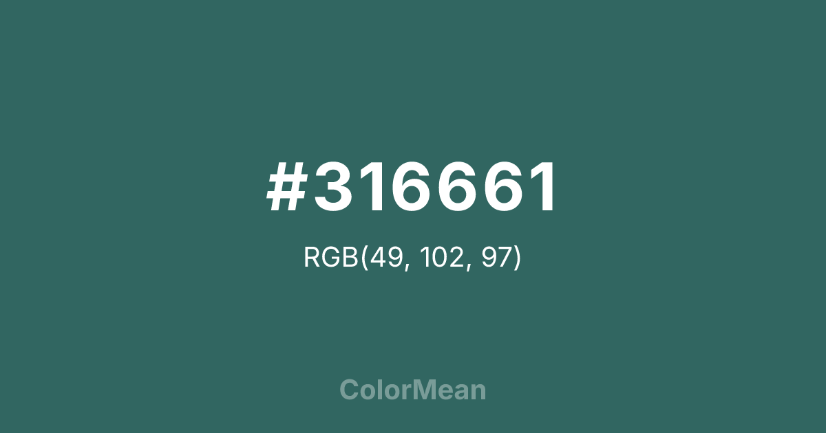 #316661 RGB value is (49, 102, 97). The hex color red value is 49, green is 102, and blue is 97. Its HSL format shows a hue of 174°, saturation of 35 percent, and lightness of 30 percent. The CMYK process values are 52 percent, 0 percent, 5 percent, 60 percent.