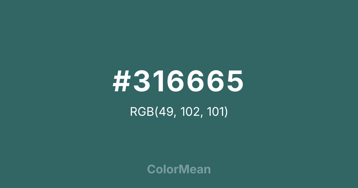 #316665 RGB value is (49, 102, 101). The hex color red value is 49, green is 102, and blue is 101. Its HSL format shows a hue of 179°, saturation of 35 percent, and lightness of 30 percent. The CMYK process values are 52 percent, 0 percent, 1 percent, 60 percent.