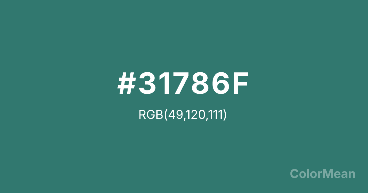 #31786F RGB value is (49, 120, 111). The hex color red value is 49, green is 120, and blue is 111. Its HSL format shows a hue of 172°, saturation of 42 percent, and lightness of 33 percent. The CMYK process values are 59 percent, 0 percent, 7 percent, 53 percent.