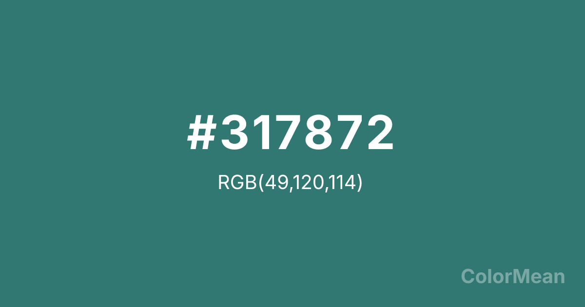 #317872 RGB value is (49, 120, 114). The hex color red value is 49, green is 120, and blue is 114. Its HSL format shows a hue of 175°, saturation of 42 percent, and lightness of 33 percent. The CMYK process values are 59 percent, 0 percent, 5 percent, 53 percent.