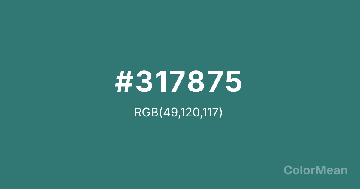 #317875 RGB value is (49, 120, 117). The hex color red value is 49, green is 120, and blue is 117. Its HSL format shows a hue of 177°, saturation of 42 percent, and lightness of 33 percent. The CMYK process values are 59 percent, 0 percent, 3 percent, 53 percent.