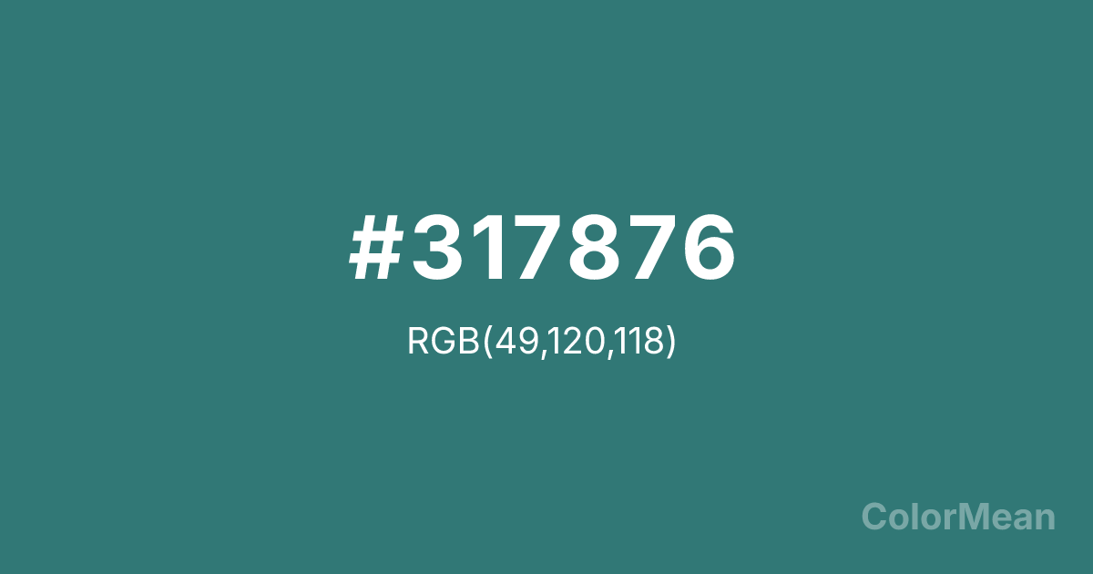 #317876 RGB value is (49, 120, 118). The hex color red value is 49, green is 120, and blue is 118. Its HSL format shows a hue of 178°, saturation of 42 percent, and lightness of 33 percent. The CMYK process values are 59 percent, 0 percent, 2 percent, 53 percent.