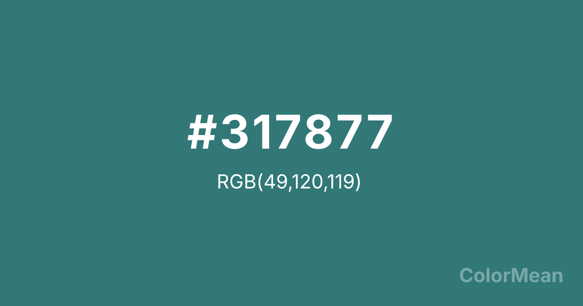 #317877 RGB value is (49, 120, 119). The hex color red value is 49, green is 120, and blue is 119. Its HSL format shows a hue of 179°, saturation of 42 percent, and lightness of 33 percent. The CMYK process values are 59 percent, 0 percent, 1 percent, 53 percent.