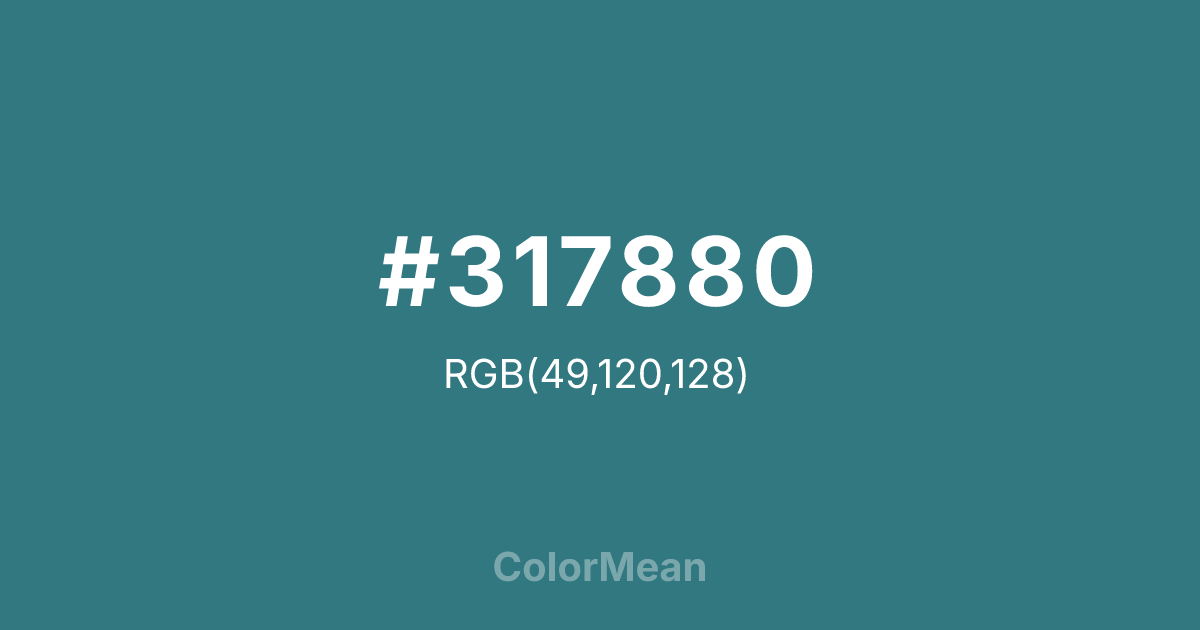 #317880 RGB value is (49, 120, 128). The hex color red value is 49, green is 120, and blue is 128. Its HSL format shows a hue of 186°, saturation of 45 percent, and lightness of 35 percent. The CMYK process values are 62 percent, 6 percent, 0 percent, 50 percent.