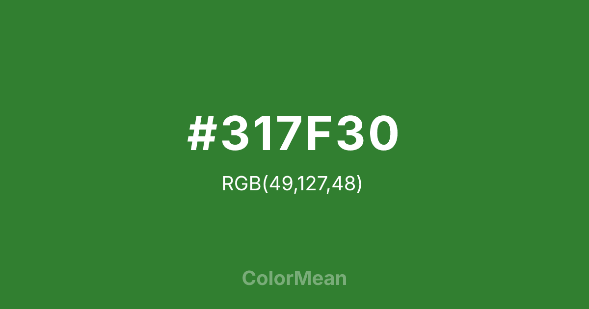 #317F30 RGB value is (49, 127, 48). The hex color red value is 49, green is 127, and blue is 48. Its HSL format shows a hue of 119°, saturation of 45 percent, and lightness of 34 percent. The CMYK process values are 61 percent, 0 percent, 62 percent, 50 percent.