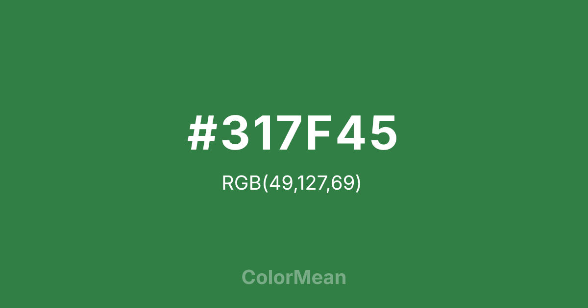 #317F45 RGB value is (49, 127, 69). The hex color red value is 49, green is 127, and blue is 69. Its HSL format shows a hue of 135°, saturation of 44 percent, and lightness of 35 percent. The CMYK process values are 61 percent, 0 percent, 46 percent, 50 percent.