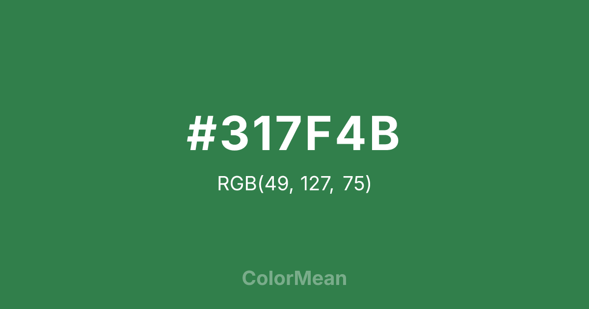 #317F4B RGB value is (49, 127, 75). The hex color red value is 49, green is 127, and blue is 75. Its HSL format shows a hue of 140°, saturation of 44 percent, and lightness of 35 percent. The CMYK process values are 61 percent, 0 percent, 41 percent, 50 percent.