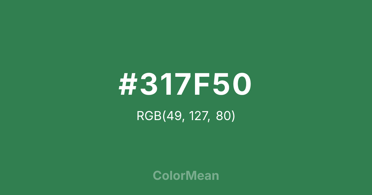 #317F50 RGB value is (49, 127, 80). The hex color red value is 49, green is 127, and blue is 80. Its HSL format shows a hue of 144°, saturation of 44 percent, and lightness of 35 percent. The CMYK process values are 61 percent, 0 percent, 37 percent, 50 percent.