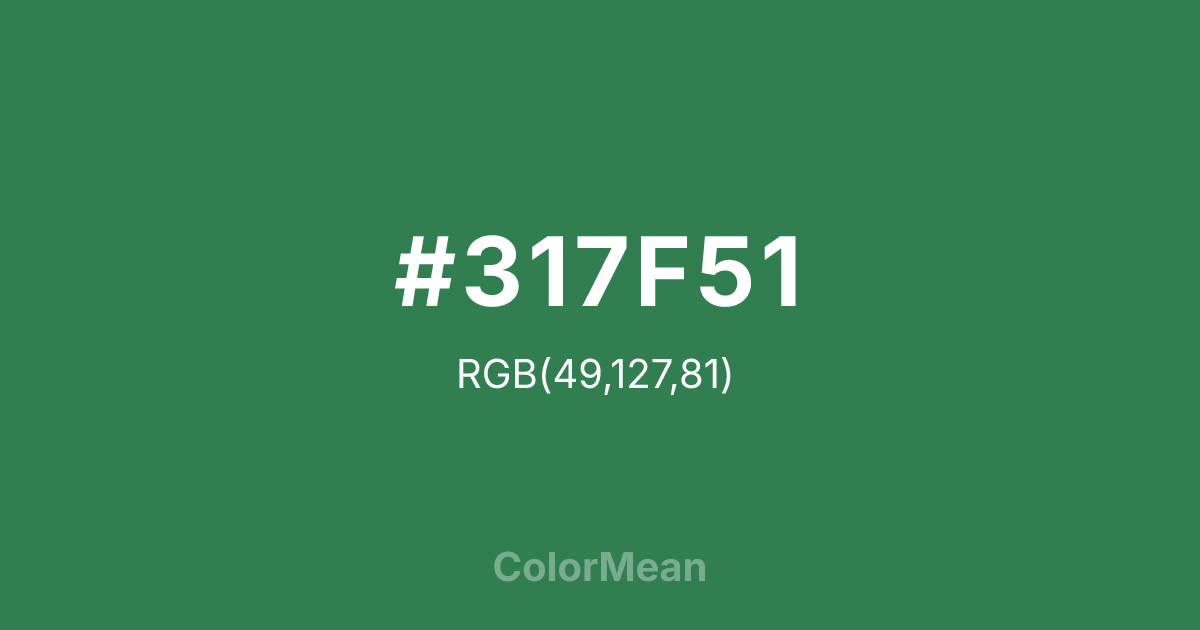 #317F51 RGB value is (49, 127, 81). The hex color red value is 49, green is 127, and blue is 81. Its HSL format shows a hue of 145°, saturation of 44 percent, and lightness of 35 percent. The CMYK process values are 61 percent, 0 percent, 36 percent, 50 percent.