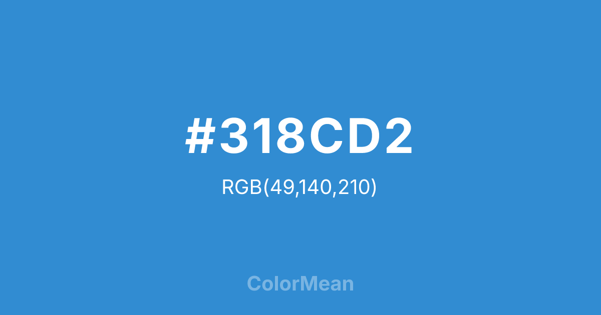#318CD2 RGB value is (49, 140, 210). The hex color red value is 49, green is 140, and blue is 210. Its HSL format shows a hue of 206°, saturation of 64 percent, and lightness of 51 percent. The CMYK process values are 77 percent, 33 percent, 0 percent, 18 percent.