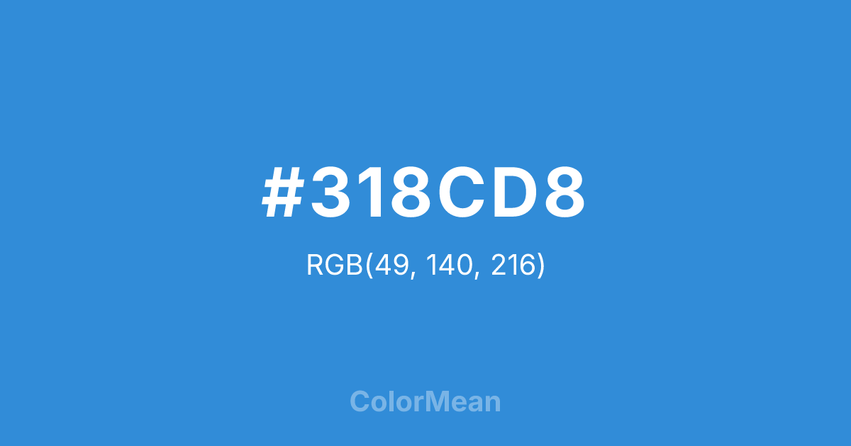 #318CD8 RGB value is (49, 140, 216). The hex color red value is 49, green is 140, and blue is 216. Its HSL format shows a hue of 207°, saturation of 68 percent, and lightness of 52 percent. The CMYK process values are 77 percent, 35 percent, 0 percent, 15 percent.