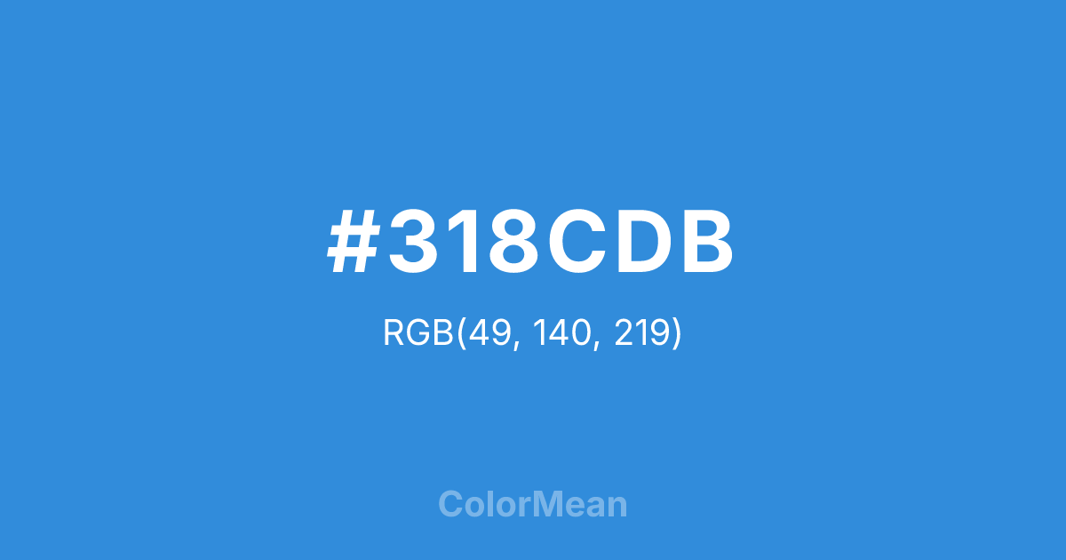 #318CDB RGB value is (49, 140, 219). The hex color red value is 49, green is 140, and blue is 219. Its HSL format shows a hue of 208°, saturation of 70 percent, and lightness of 53 percent. The CMYK process values are 78 percent, 36 percent, 0 percent, 14 percent.