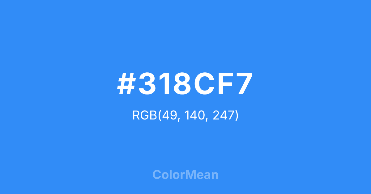 #318CF7 RGB value is (49, 140, 247). The hex color red value is 49, green is 140, and blue is 247. Its HSL format shows a hue of 212°, saturation of 93 percent, and lightness of 58 percent. The CMYK process values are 80 percent, 43 percent, 0 percent, 3 percent.