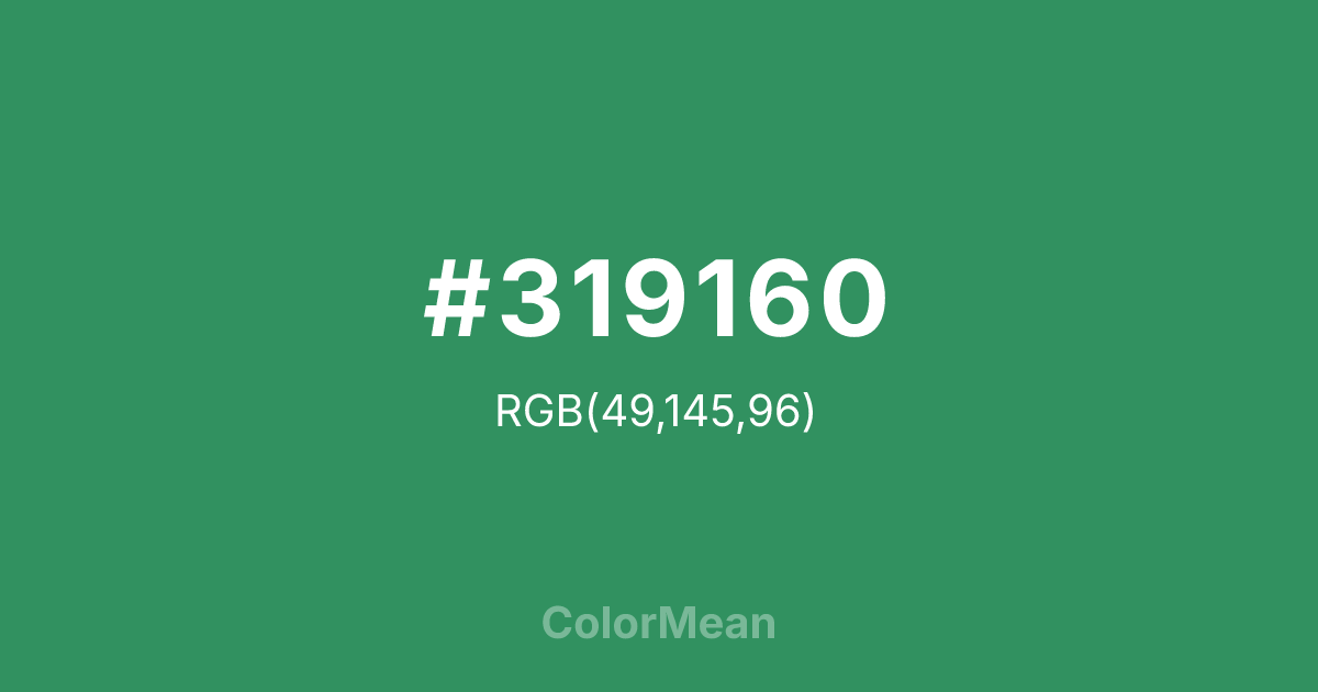 #319160 RGB value is (49, 145, 96). The hex color red value is 49, green is 145, and blue is 96. Its HSL format shows a hue of 149°, saturation of 49 percent, and lightness of 38 percent. The CMYK process values are 66 percent, 0 percent, 34 percent, 43 percent.