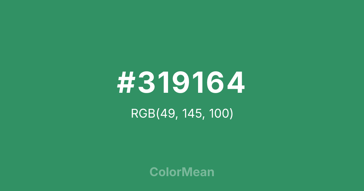 #319164 RGB value is (49, 145, 100). The hex color red value is 49, green is 145, and blue is 100. Its HSL format shows a hue of 152°, saturation of 49 percent, and lightness of 38 percent. The CMYK process values are 66 percent, 0 percent, 31 percent, 43 percent.