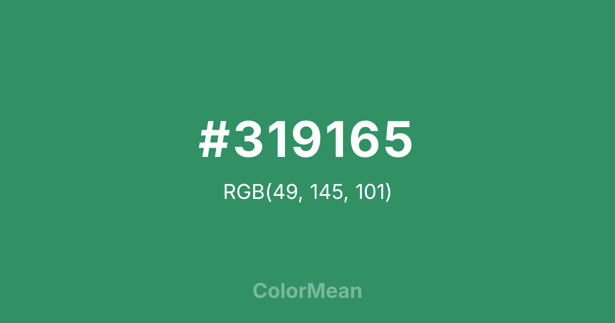 #319165 RGB value is (49, 145, 101). The hex color red value is 49, green is 145, and blue is 101. Its HSL format shows a hue of 153°, saturation of 49 percent, and lightness of 38 percent. The CMYK process values are 66 percent, 0 percent, 30 percent, 43 percent.