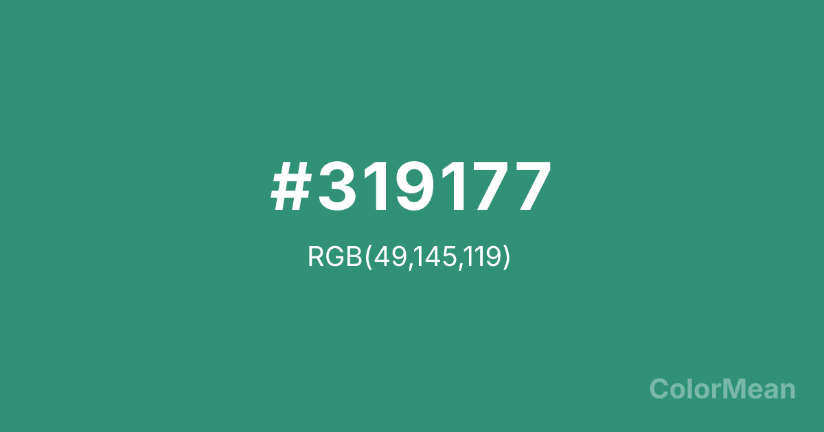 Illuminating Emerald (#319177) RGB value is (49, 145, 119). The hex color red value is 49, green is 145, and blue is 119. Its HSL format shows a hue of 164°, saturation of 49 percent, and lightness of 38 percent. The CMYK process values are 66 percent, 0 percent, 18 percent, 43 percent.