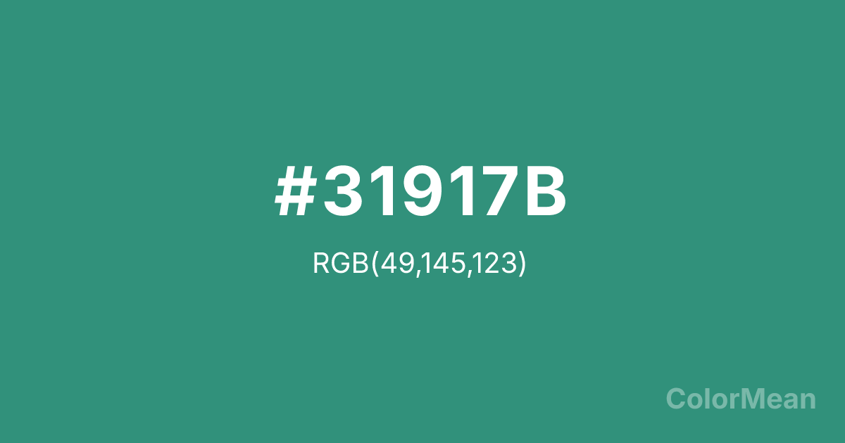 #31917B RGB value is (49, 145, 123). The hex color red value is 49, green is 145, and blue is 123. Its HSL format shows a hue of 166°, saturation of 49 percent, and lightness of 38 percent. The CMYK process values are 66 percent, 0 percent, 15 percent, 43 percent.