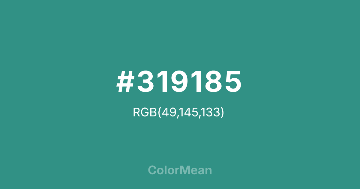 #319185 RGB value is (49, 145, 133). The hex color red value is 49, green is 145, and blue is 133. Its HSL format shows a hue of 173°, saturation of 49 percent, and lightness of 38 percent. The CMYK process values are 66 percent, 0 percent, 8 percent, 43 percent.