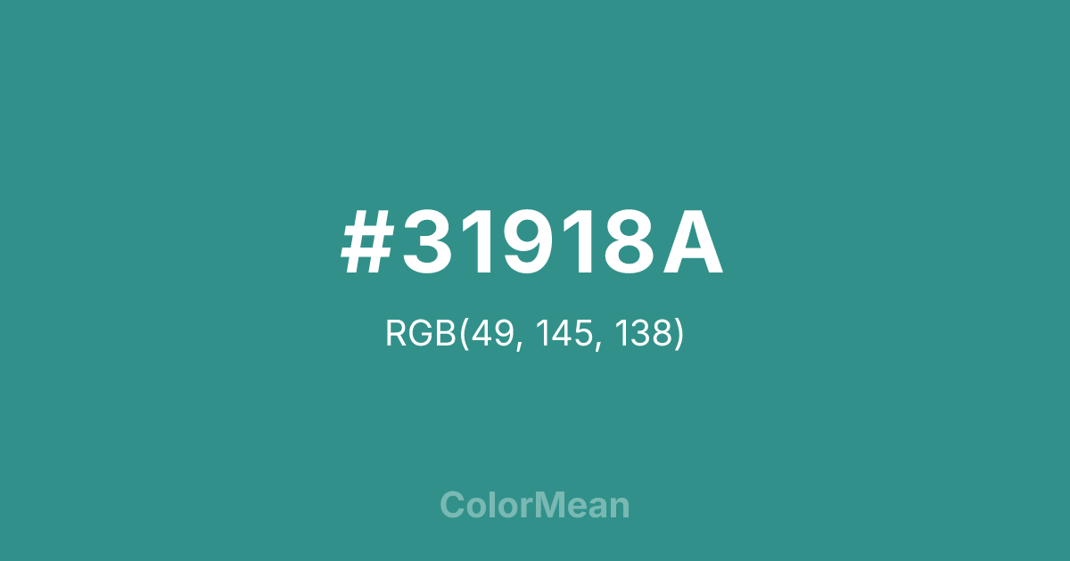 #31918A RGB value is (49, 145, 138). The hex color red value is 49, green is 145, and blue is 138. Its HSL format shows a hue of 176°, saturation of 49 percent, and lightness of 38 percent. The CMYK process values are 66 percent, 0 percent, 5 percent, 43 percent.