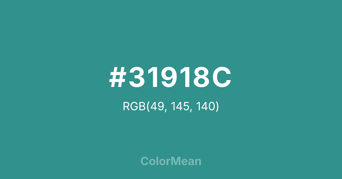#31918C RGB value is (49, 145, 140). The hex color red value is 49, green is 145, and blue is 140. Its HSL format shows a hue of 177°, saturation of 49 percent, and lightness of 38 percent. The CMYK process values are 66 percent, 0 percent, 3 percent, 43 percent.