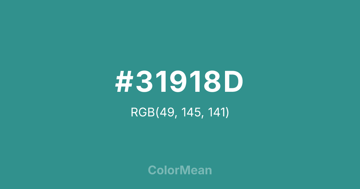 #31918D RGB value is (49, 145, 141). The hex color red value is 49, green is 145, and blue is 141. Its HSL format shows a hue of 178°, saturation of 49 percent, and lightness of 38 percent. The CMYK process values are 66 percent, 0 percent, 3 percent, 43 percent.