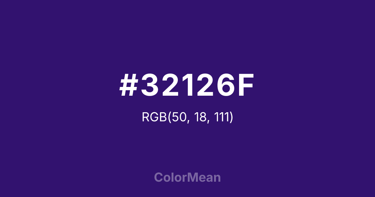 #32126F RGB value is (50, 18, 111). The hex color red value is 50, green is 18, and blue is 111. Its HSL format shows a hue of 261°, saturation of 72 percent, and lightness of 25 percent. The CMYK process values are 55 percent, 84 percent, 0 percent, 56 percent.